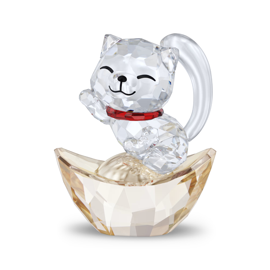 This crystallised interpretation of the iconic Lucky Cat is a showcase of Swarovski’s skilful precision cutting. Crafted with 481 facets, the cat sits on a golden ingot, beckoning for wealth with its right paw uplifted. Joyful details include the cat’s happy expression, its bright red collar and large fluffy tail. Place this cute figurine at the centre of your décor to bring good luck into your home. Decoration object. Not a toy. Not suitable for children under 15.